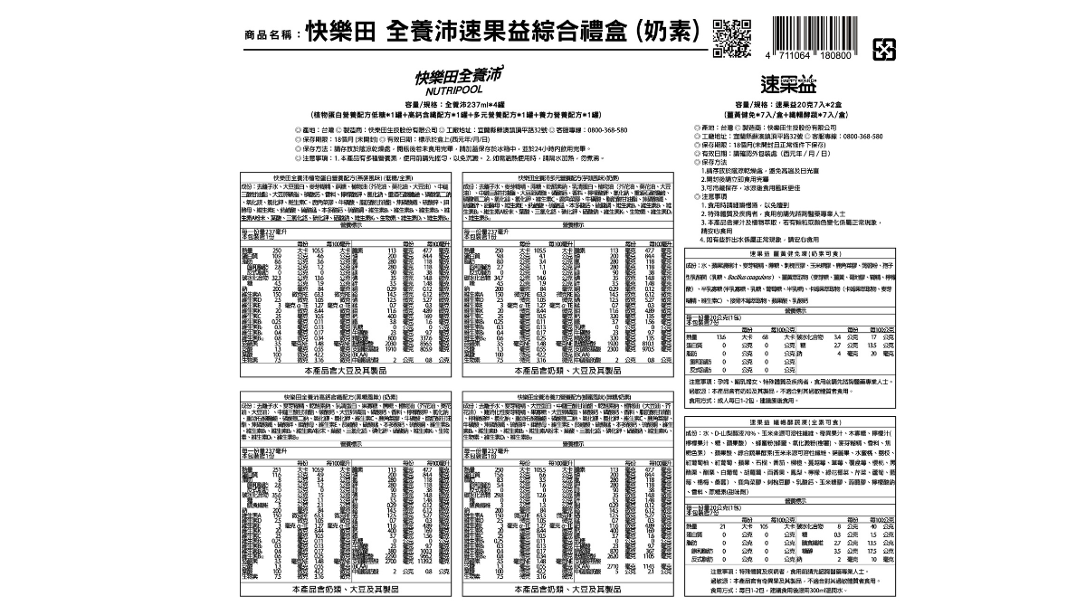 植物蛋白低糖(237ml) x 1罐 + 高鈣含纖(237ml) x 1罐 + 多元營養(237ml) x 1罐 + 養力營養(237ml) x 1罐 + 薑黃健免凍(7條) x 1盒 + 纖暢酵蔬凍(7條) x 1盒